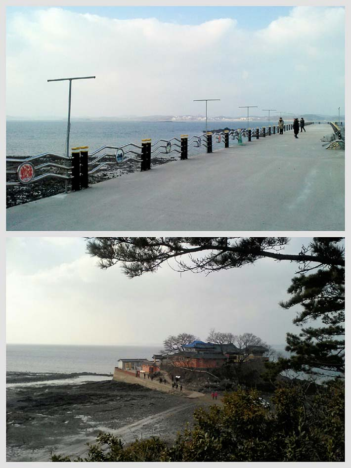 바다 위에서 간월도를 전체를 바라보는 스카이워크가 핫플레이스이다. 간월도 스카이워크는 충남도가 ‘2025-2026 충남 방문의 해’를 맞아 야간 관광명소 중 하나로 선정한 곳이다. 낮에는 천수만과 간월암을, 해질 무렵엔 붉게 물든 노을과 야경을 조망할 수 있다. 바다 위 테크 길을 걸어가면 끝 지점에 원형 조형물이 있다. 이 조형물 원 안으로 간월암으로 들어서고 이를 배경으로 인증샷을 찍는 포토존이다. 이 촬영 지점은 마치 동해안 양양 낙산사 홍련암, 의상대 일출 장소를 떠올린다. 그렇게 서해 일몰 풍경을 담는 인기 전망 포인트이다.