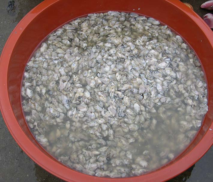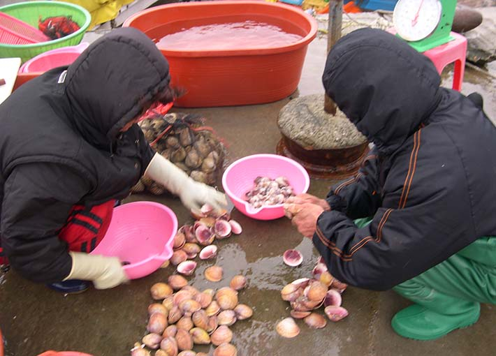 간월도 식당에서는 갓 잡은 새조개도 추천 메뉴 중 하나이다. 조개 속살이 새의 부리를 닮았다고 해서 새조개라고 부른다. 데쳐 먹을 수도 있고 구워먹을 수 있고, 국물을 우려내 칼국수로도 먹는다.